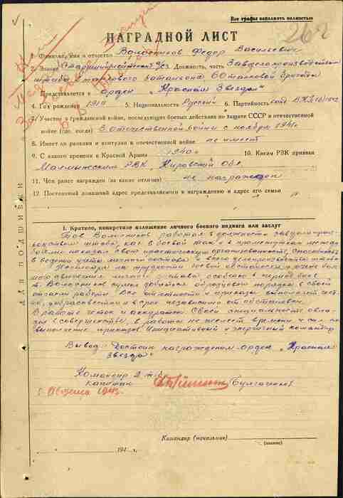Несмотря на трудности боевой обстановки и очень большого движения личного состава, особенно в период боев, товарищ Волосников сумел добиться образцового порядка в своей отрасли работы. Все отчетности и приказы выполняет честно, добросовестно и в срок, независимо от обстановки.