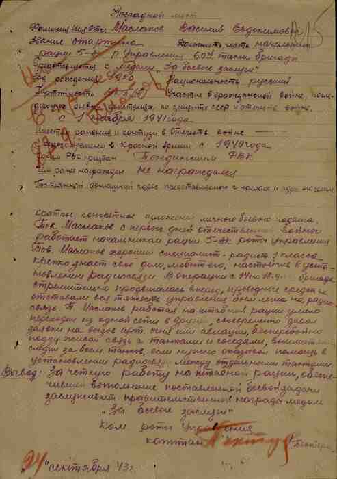 Товарищ Маслаков с первых дней Отечественной войны работает начальником рации 5-АК роты управления. Товарищ Маслаков - хороший специалист, радист 1 класса, крепко знает свое дело, любит его, настойчив в установлении радиосвязи.