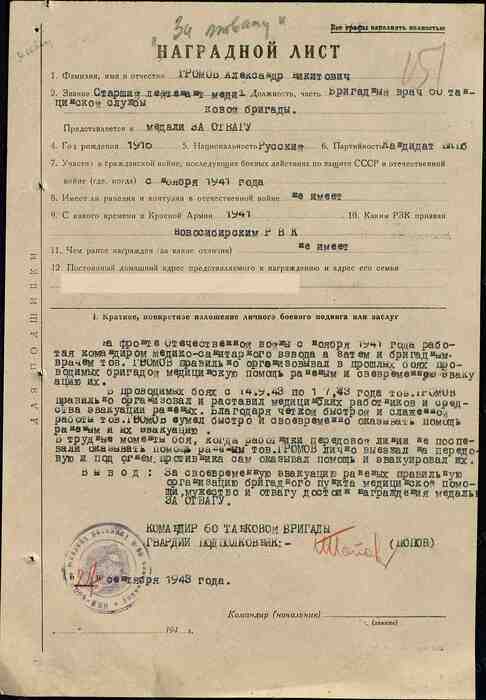На фронтах Отечественной войны с ноября 1941 года. Работая командиром медико-санитарного взвода, а затем и бригадным врачом, товарищ Громов правильно организовал в прошлых боях, проводимых бригадой, медицинскую помощь раненым и своевременную эвакуацию их.