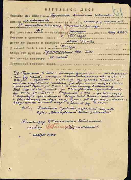 Товарищ Пушнегин в боях с немецко-фашистскими захватчиками под деревней Котово показал исключительные образцы мужества и героизма.