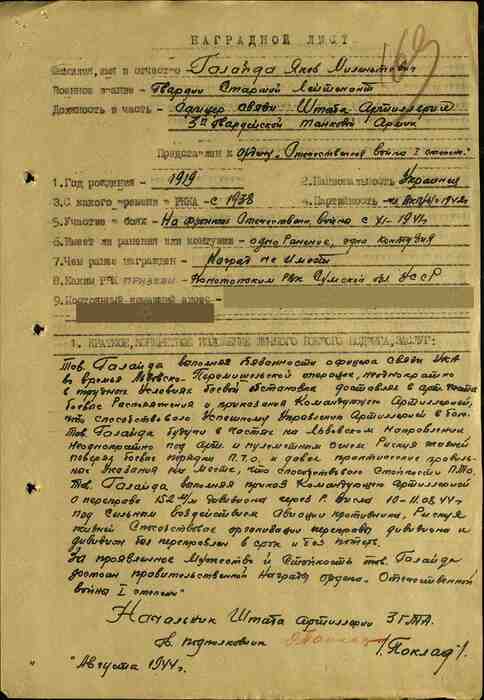За проявленное мужество и стойкость товарищ Галайда достоин правительственной награды Ордена Отечественной войны I степени.