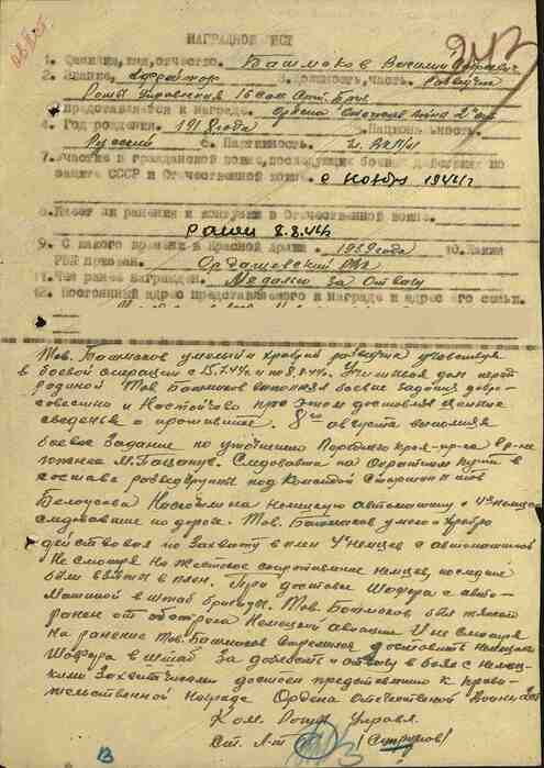 08 августа выполнял боевое задание по уточнению переднего края противника в районе южнее м. Пацанув. Следуя на обратном пути в составе разведгруппы под командой старшины товарища Белоусова, наскочили на немецкую автомашину с 4-мя немцами, следовавшие по дороге. Товарищ Башмаков умело и храбро действовал по захвату 4-х немцев с автомашиной.
