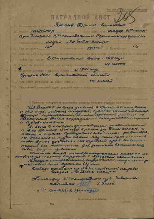 Товарищ Зиновьев за время участия в Отечественной войне с 1941 года, работая шофером, проявил исключительные образцы мужественной, самоотверженной работы по обеспечению боевых подразделений боеприпасами, горючим и продовольствием.
