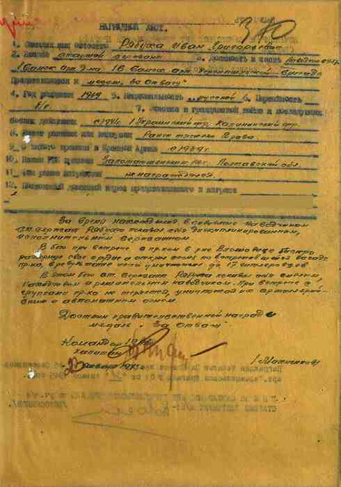 Уроженец (или же проживавший перед призывом): Украинская ССР (ныне - Украина) Полтавская (ныне - Черкасская) область Золотоношский район село Крапивна