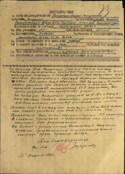 Только лишь в последней операции с 12 по 20 января (1945 года) в тяжелых боевых условиях при больших помехах товарищ Старочкин сам лично передал и принял 169 радиограмм с боевыми приказами и донесениями, сам лично исправил три радиостанции.