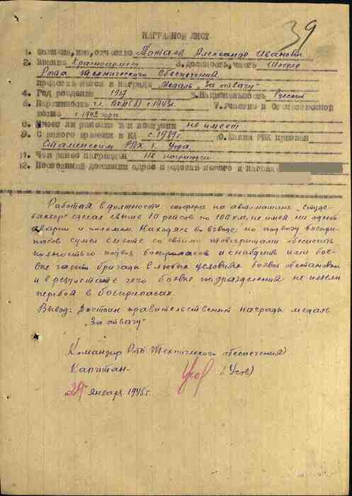 Работая в должности шофера на автомашине "Студебеккер", сделал свыше 10 рейсов по 100 км, не имея ни одной аварии и поломки.