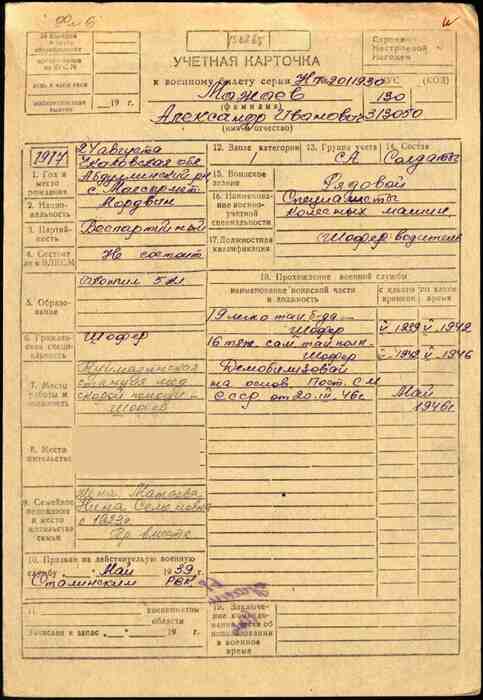 Воинская должность: шофер (дослужился до должности шофера 16 самоходной артиллерийской Перемышльской Краснознаменной бригаде 3 гвардейской Танковой Армии 1 Украинского фронта)