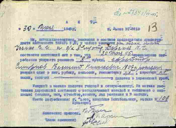 Ранения (на момент составления официальных документов): одно легкое ранение, в июне 1945 года находился на излечении в ЭГ 3219 в городе Львов, где и скончался от полученного отравления