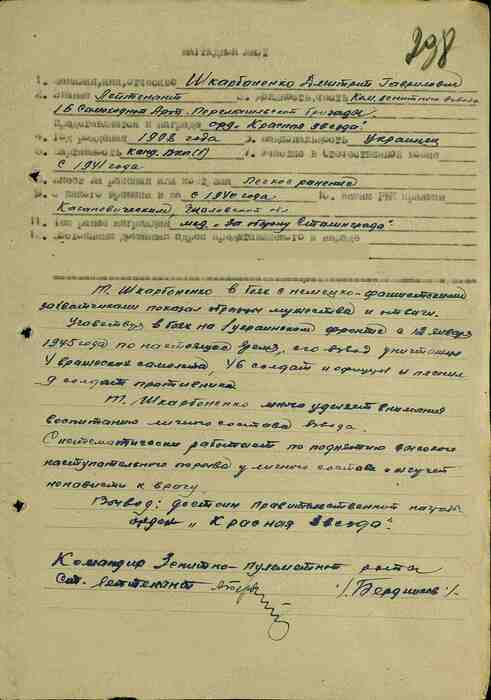 Товарищ Шкарбаненко в боях с немецко-фашистскими захватчиками показал образцы мужества и отваги.