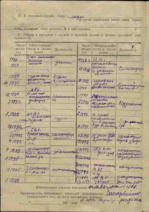 Призывался на воинскую службу: Кагановичский (ныне - Калининский) РВК Краснодарский край, по другим данным - Кагановичский РВК город Чкалов (ныне - Оренбург) Чкаловская (ныне - Оренбургская) область, в Красной Армии с 25 ноября 1930 года (по другим данным - с 15 сентября 1930 года, с 15 ноября 1930 года) по апрель 1933 года, вновь призван и проходил обучение на курсах младших лейтенантов до июля 1940 года, вновь призван в ряды Красной Армии 07 октября (по другим данным - 06 июля) 1941 года, в 1932 году закончил бронетанковые курсы, а в 1940 году - курсы младших лейтенантов, выбыл из рядов Советской Армии 25 октября (по другим данным - 25 ноября) 1945 года