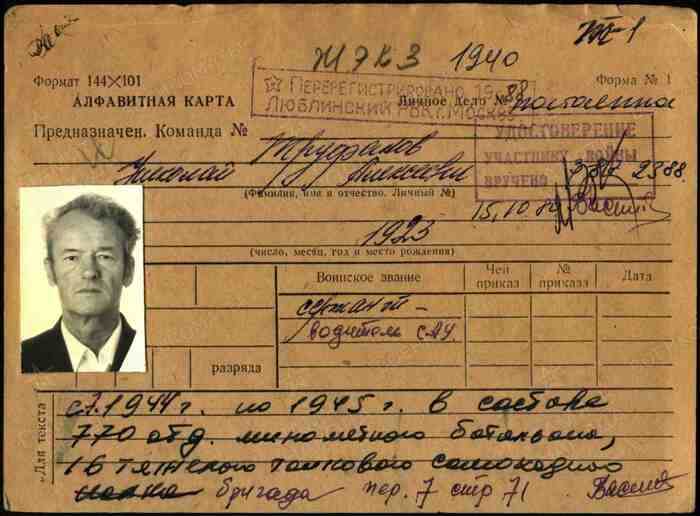 Воинское соединение: 16 самоходная артиллерийская Перемышльская бригада 1 Украинского фронта, маловероятно, но не исключено полностью, что служил под Тихвином в составе 60 танковой дивизии