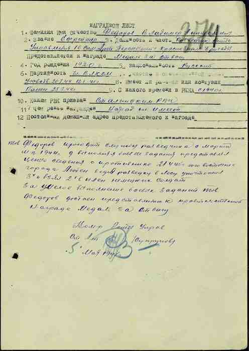 За умелое выполнение боевых заданий товарищ Федоров достоин предоставления к правительственной награде Медали "За отвагу".