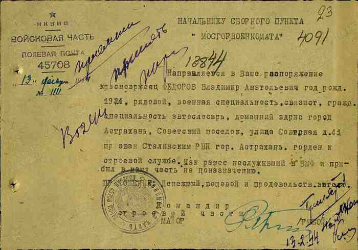 Уроженец (или же проживавший перед призывом): Сталинградская (ныне - Астраханская) область город Астрахань Советский поселок улица Советская дом 41