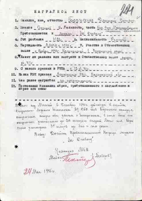 В боях под Москвой 06 декабря 1941 года, действуя в составе отдельного лыжного батальона 29 стрелковой бригады, товарищ Борисенко, командуя отделением, показал себя умелым и бесстрашным. В этом бою его отделение уничтожило до 20 немецких солдат. Лично товарищ Борисенко уничтожил 3-х немцев, где был и сам ранен.