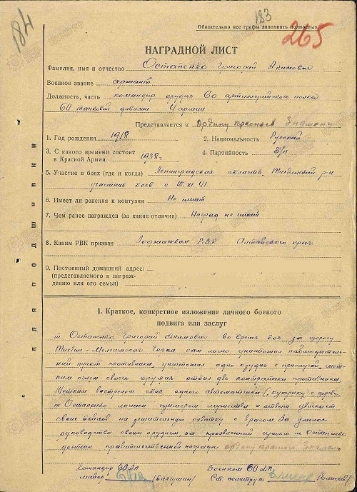 Товарищ Остапенко Григорий Акимович во время боя за дорогу Тихвин - Мелегежская Горка сам лично уничтожил одно орудие с прислугой, метким огнем своего орудия отбил две контратаки противника.