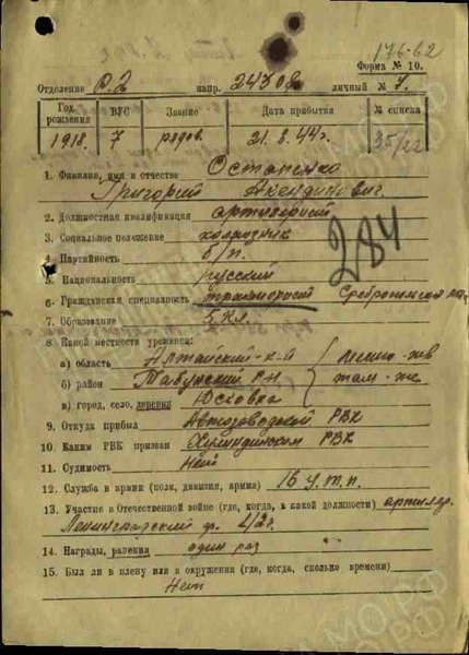 В дополнение к выложенной инфе по воину «Остапенко Григорий Акимович (Акиндинович, Акендинович 1918»» добавил бы, хоть и спорные, но свои (дед Митяй) «5ять копеек», а именно, если предположить, что отчество могло быть трансформировано «Акимович = Акиндинович, Акендинович», у всех поисковых вариантов место рождения = Алтайский край + оба воина артиллеристы + оба воина из танкового подразделения…