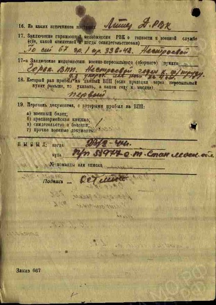 Куда убыл: п/п 53977, Московская обл., ст. Теплый стан (в ЦАМО опечатка от оператора ввода инфы – см. скан № 2