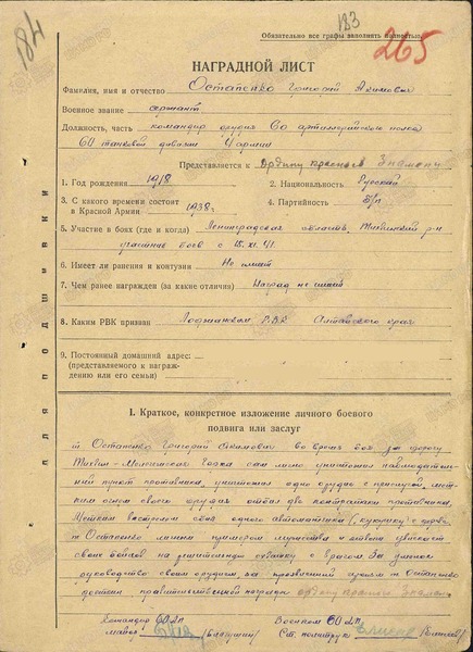 Товарищ Остапенко личным примером мужества и отваги увлекает своих бойцов на решительную схватку с врагом. За умелое руководство своим орудием, за проявленный героизм товарищ Остапенко достоин правительственной награды.