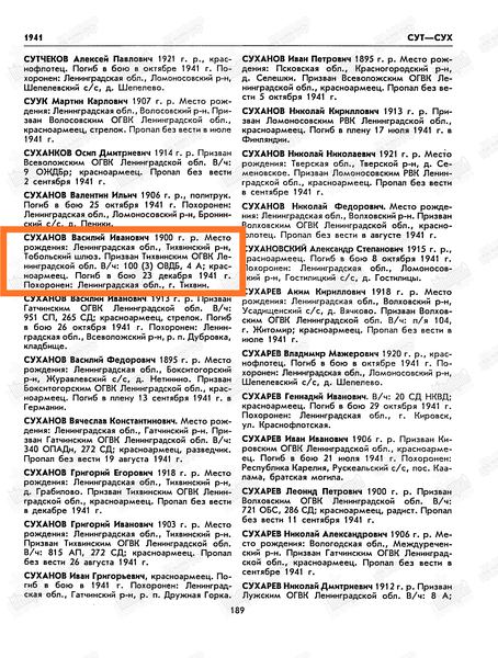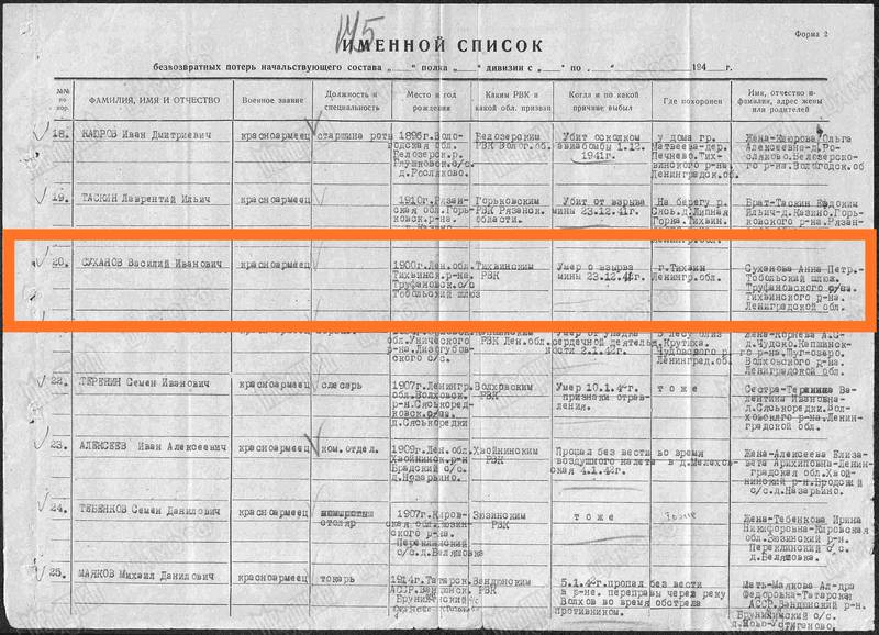 Справка: по воину «Суханов Василий Иванович 1900 (Суканов, 1901» строка в эксель-базе безвозвратных потерь по Тихвину и Тихвинскому р-ну выглядит так: