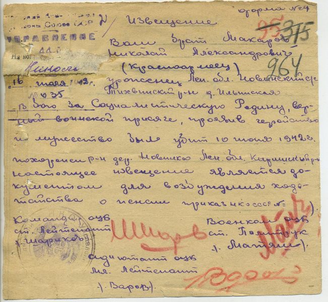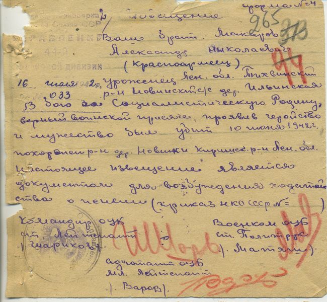 Справка: кроме, наиболее вероятной, опечатки в похоронке № 2, нигде не встречается воин с фамилией «Макаров», но с обратным именем-отчеством (Николай Александрович)