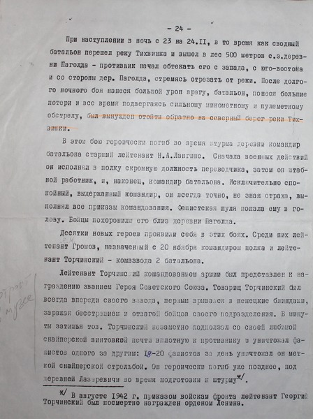 «За период ожесточенного боя 16-18 ноября 1941 г. под д. Паголда и совхоз «1-е Мая», т. Торчинский проявил смелость, мужество и геройство.