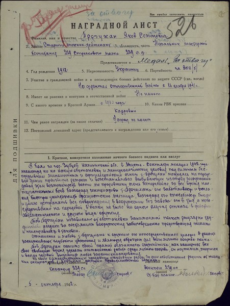 За свою самоотверженную, преданную и активную работу, за дело освобождения Родины от немецких оккупантов, т. Прочухан достоин правительственной награды…» 05.10.1942