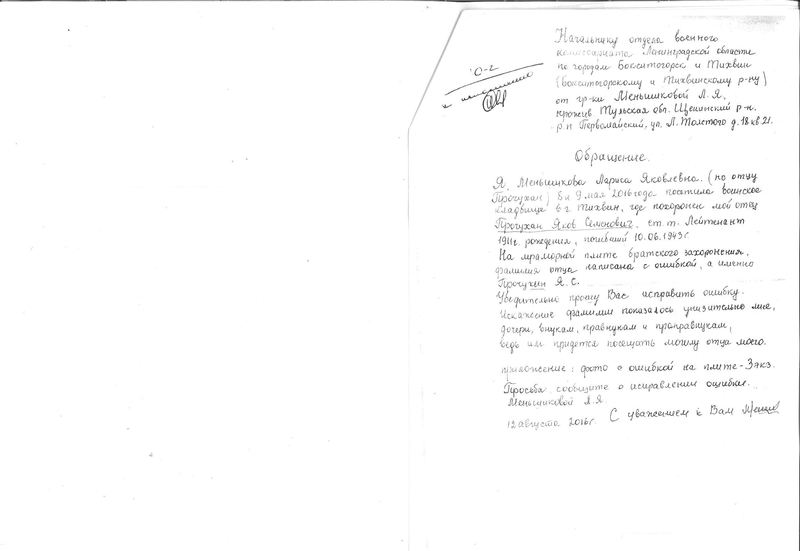 01.09.2016 в личку пришёл запрос от админов по воину «Прочухан Яков Семенович (Прочухин,1912 (1911», а затем прислали и письмо родственников: