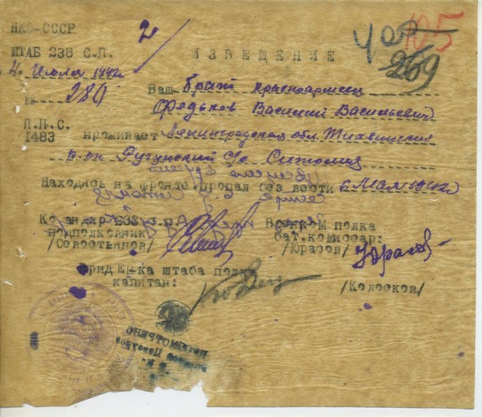 Место призыва: __.__.1941 Ефимовский РВК, Ленинградская обл., Ефимовский р-н