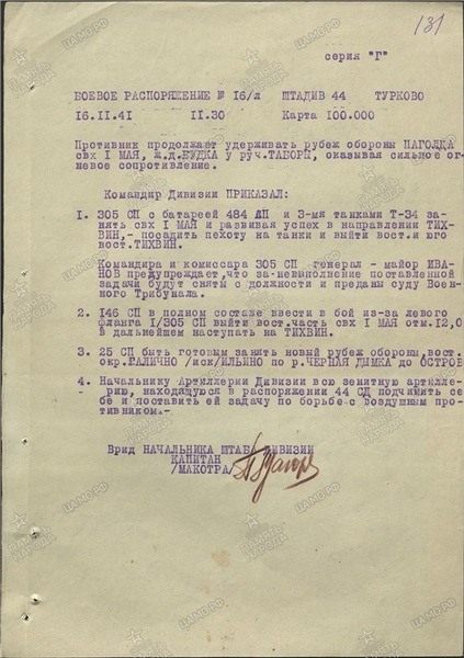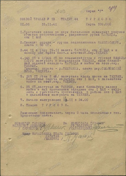 … 3. 44 СД к утру 19.11.1941 занять Паголда, свх. 1 Мая и к исходу дня выйти вост. и юго-вост. окр. Тихвин.