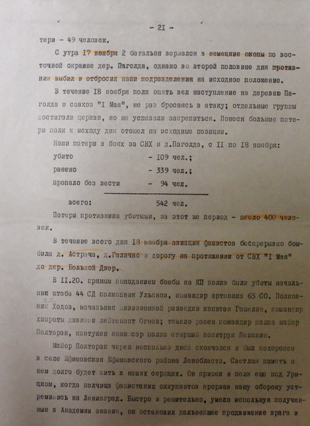 «… С утра 17 ноября 2 батальон ворвался в немецкие окопы по восточной окраине дер. Паголда, однако, во второй половине дня противник выбил и отбросил наши подразделения на исходное положение…
