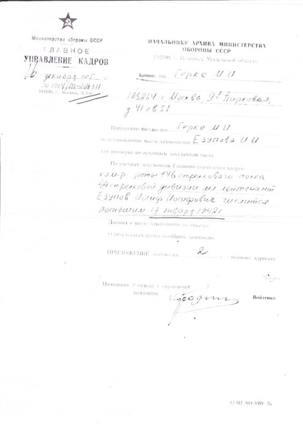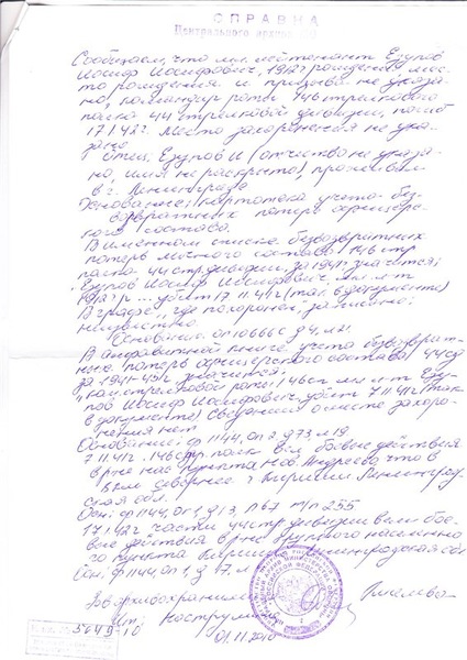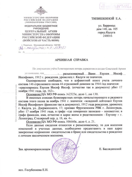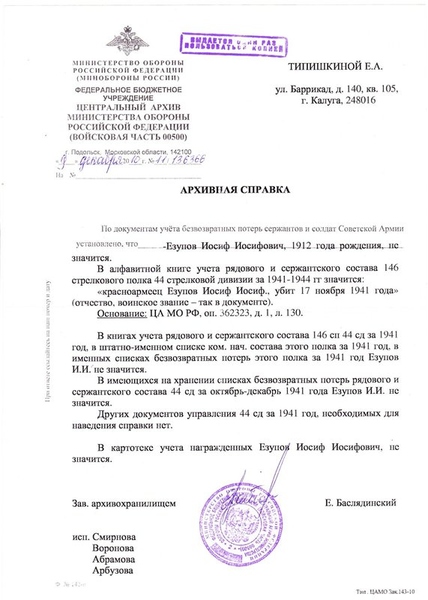 Дальнейшая серия выкладок – результат кропотливой переписки Семьи с чиновниками разных мастей с целью выяснения военной судьбы воина «Езупов Иосиф Иосифович (Езунов 1912» (таки пару файлов упускаю – ни о чём):