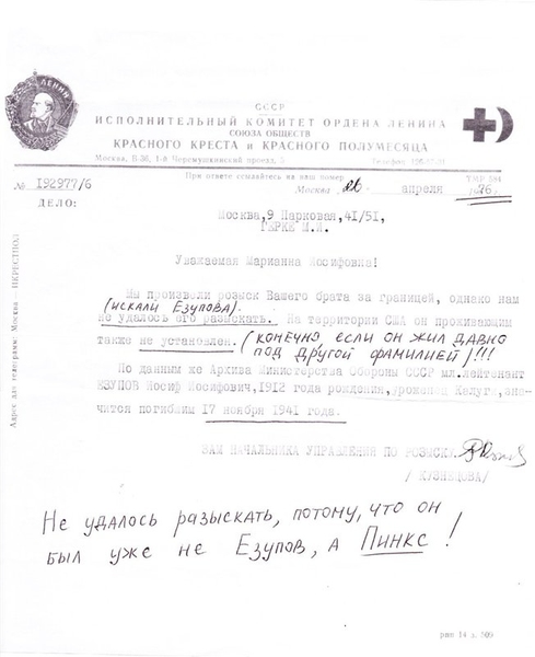 Как бы то ни было, родственники продолжали поиск данных. Елена сообщает, что в 1970 году в Ленинград, на имя любимой женщины Иосифа Эллен пришло уведомление о письме из Америки от некоего Пинкса. Через два года с главпочтамта ей поступил запрос о получении двух писем из Калифорнии. К сожалению, кто-то из родственников, опасаясь гонений за «связи с агрессором - США» ответил, что ничего не получали и не выясняли. Обращение сестры Иосифа Марианны в общество Красного Креста в апреле 1976 года по поводу поиска Иосифа тоже ничего не дало. А ведь тогда у родных появилась надежда – вдруг он не погиб, был послан с заданием в тыл врага, а после войны направлен за океан? Совершенно беспочвенными такие мысли не назовешь, тем более, что сама Эллен подобную возможность развития событий допускала, о чем можно судить из сохранившегося в семейном архиве ее письма. Откровенно говоря, хотелось бы поверить в это и нам.