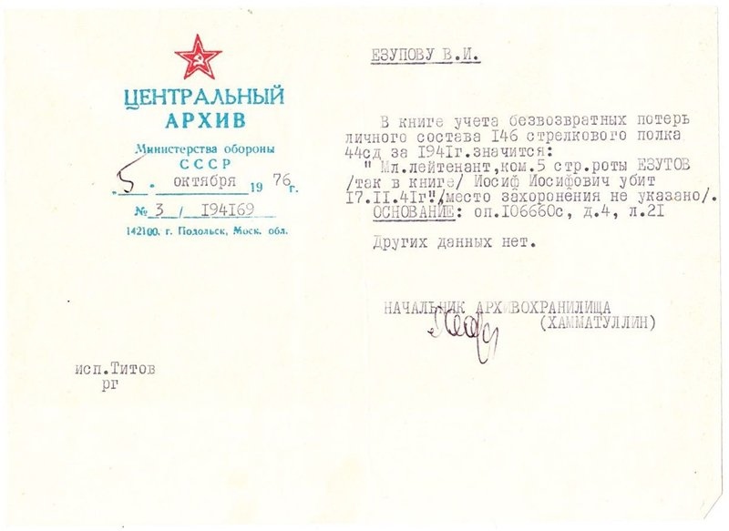 http://forum.patriotcenter.ru/index.php?topic=63740.0 можно просмотреть тексты за 17.11.1941 – дату безвозвратной потери воина «Езупов Иосиф Иосифович (Езунов 1912» в должности мл. лейтенант, командира 5 СР, 146 СП, 44 СД: