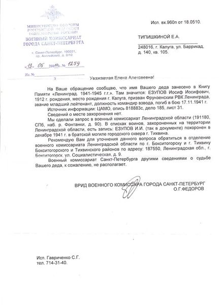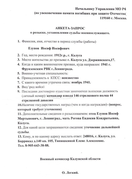 Но обо всем по порядку. Когда Дмитрий Александрович занялся оформлением современного паспорта захоронения у «Звезды Славы», то по базе данных выяснил, что И.И. Езупов, 1912 года рождения, призван Фрунзенским районным военкоматом г. Ленинграда. Воинское звание – младший лейтенант, должность командир взвода. Место службы – 44 стрелковая дивизия, 146 стрелкового полка. Причина выбытия – убит 17 ноября 1941 года. В документе были указаны также данные о родителях.