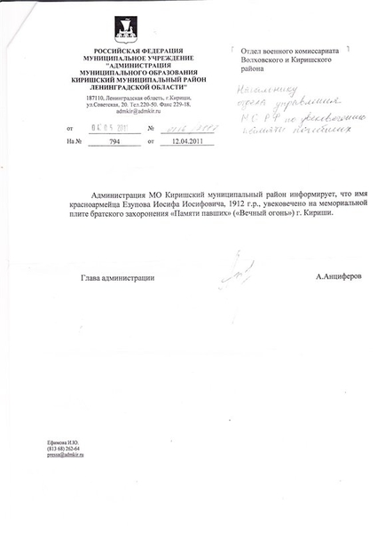 Файл: «Тихвин_Звезда_Езупов.И.И_16_Справка_ЦАМО_01.11.2010»