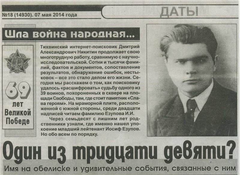 Тихвинский интернет-поисковик Дмитрий Александрович Никитин продолжает свою многотрудную работу, сравнимую с научной исследовательской деятельностью. Сотни и тысячи фамилий, фактов и документов, сопоставление результатов, обнаружение ошибок, нестыковок – все это стало делом его жизни. Сегодня мы расскажем о том, как поисковику удалось «расшифровать» судьбу одного из 39 воинов, похороненных в сквере на площади Свободы, там, где стоит памятник «Звезда Славы». На мраморной плите, находящейся с южной стороны, среди других - фамилия Езупов И.И.