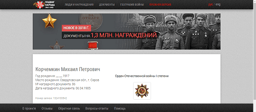 Справка: по воину «Корчемкин Михаил Петрович (Карчемкин 08.11.1917» строка в эксель-базе награждённых по Тихвину и Тихвинскому р-ну выглядит так:
