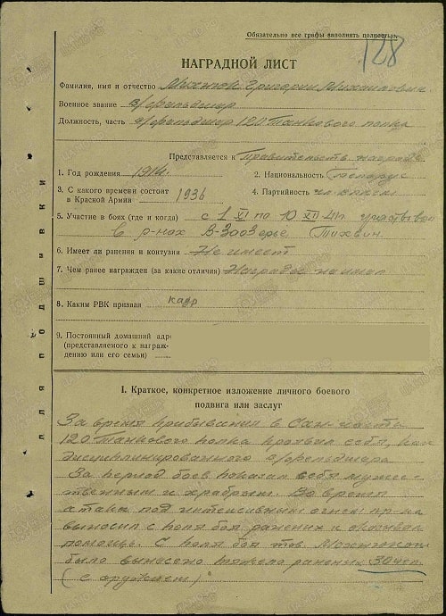 указан в качестве награжденного Медалью "За отвагу" на основании текста Приказа войскам 4 Армии Nº 06/н от 30/03/1942 за бои под Тихвином