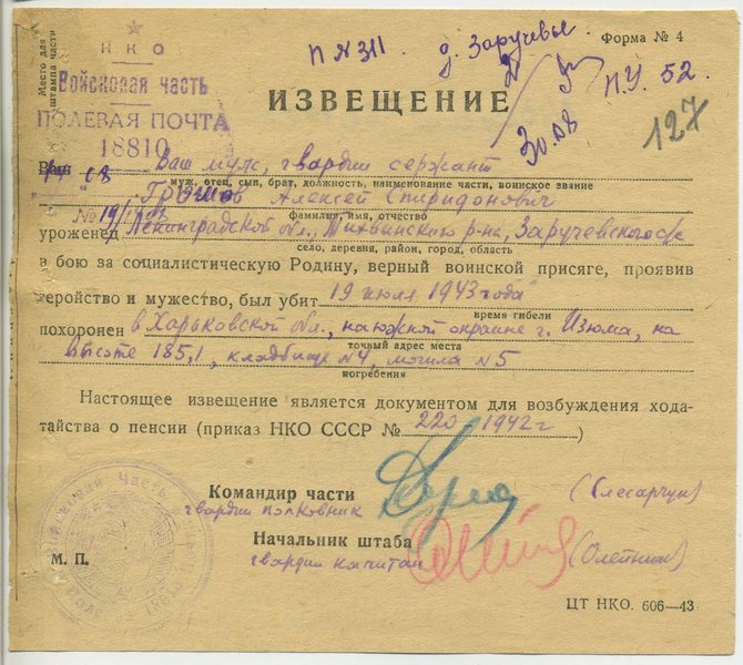 Жена Громова Мария Ивановна, проживает Ленинградская обл., Тихвинский р-н, Заручевский с/с