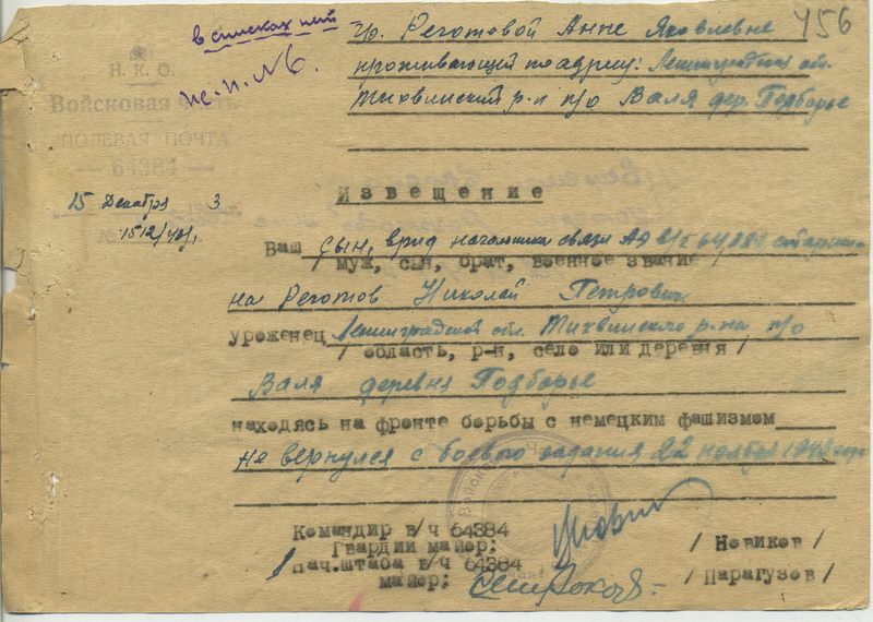 Именная тема, посвящена призывнику Тихвинского РВК «Реготов Николай Петрович 1918 (1921, 1919», отсутствующего в представленных им списках, однако, имеющего следующую архивную историю: