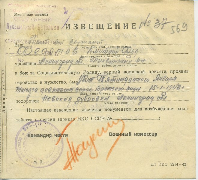 Извещение о гибели воина = похоронка