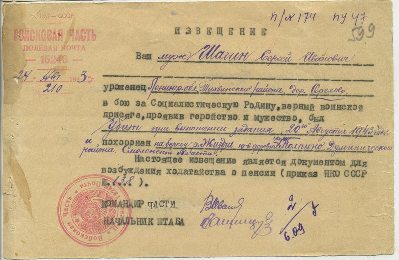 Справка: по воину «Шагин Сергей Иванович 1911» строка в эксель-базе похоронок на земляков по Тихвину и Тихвинскому р-ну выглядит так: