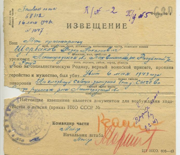 Справка: воин «Щербаков Федор Николаевич 1906 (Никоаевич»