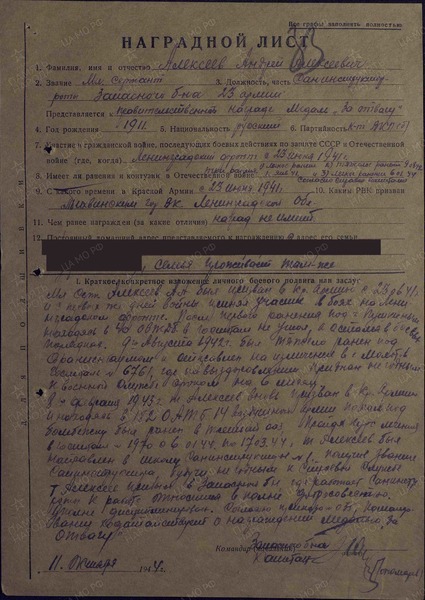 «Мл. серж. Алексеев А.А. был призван в Кр. Армию с 23.06.1941 г. и с первых же дней войны принял участие в боях на Ленинградском фронте.