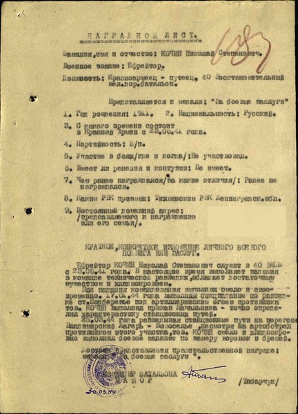 Справка: воин «Кочин Николай Степанович 22.05.1911» ефрейтор, путеец, награждён МЕДАЛЬЮ «ЗА БОЕВЫЕ ЗАСЛУГИ»