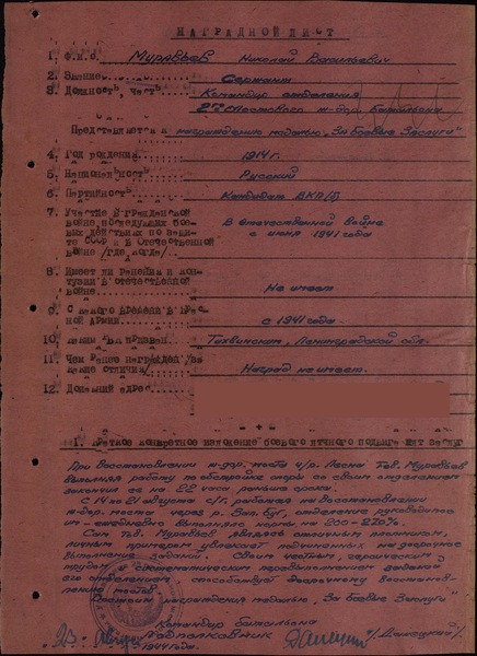 Справка: воин «Муравьев Николай Васильевич 1914» сержант, командир отделения, награждён МЕДАЛЬЮ «ЗА БОЕВЫЕ ЗАСЛУГИ»