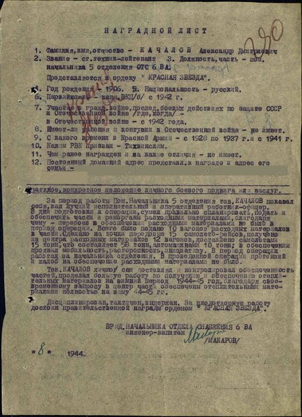 Справка: воин «Качалов Александр Дмитриевич 1906» ст. техник-лейтенант, (в учётной карточке капитан), пом. нач. 5 отд. ОТС 6 ВА, награждён ОРДЕНОМ КРАСНОЙ ЗВЕЗДЫ