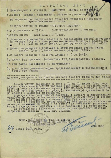 Справка: воин «Васоркин Максим Николаевич 1923» мл. лейтенант, командир ИСУ 122, награждён ОРДЕНОМ ОТЕЧЕСТВЕННОЙ ВОЙНЫ 1 СТЕПЕНИ (в наградном листе представлялся к Ордену Красного Знамени)