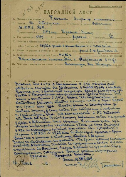 Наград за пребывание на фронте и за время лечения в госпитале не имеет, а поэтому считаем за проделанные боевые подвиги и преданное выполнение боевых заданий на фронте и перед командованием старшина Качалов достоин награждения - ОРДЕНОМ КРАСНОГО ЗНАМЕНИ»