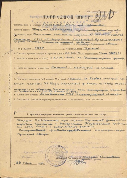Справка: воин «Булышев Николай Иванович 1905» лейтенант администр. службы, (в учётной карточке гв. ст. лейтенант администр. Службы), старший приёмщик 151 военно-почтовой станции, награждён МЕДАЛЬЮ «ЗА БОЕВЫЕ ЗАСЛУГИ»